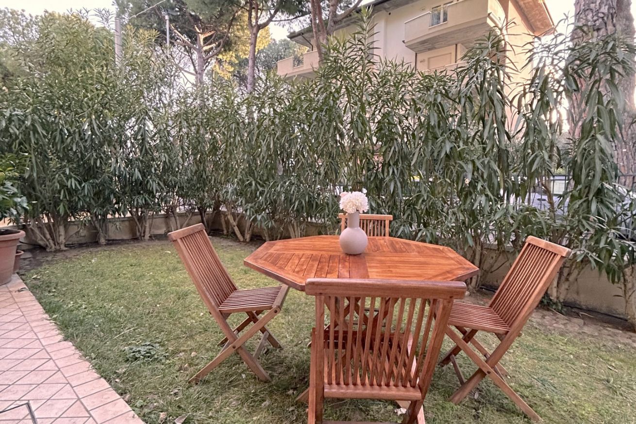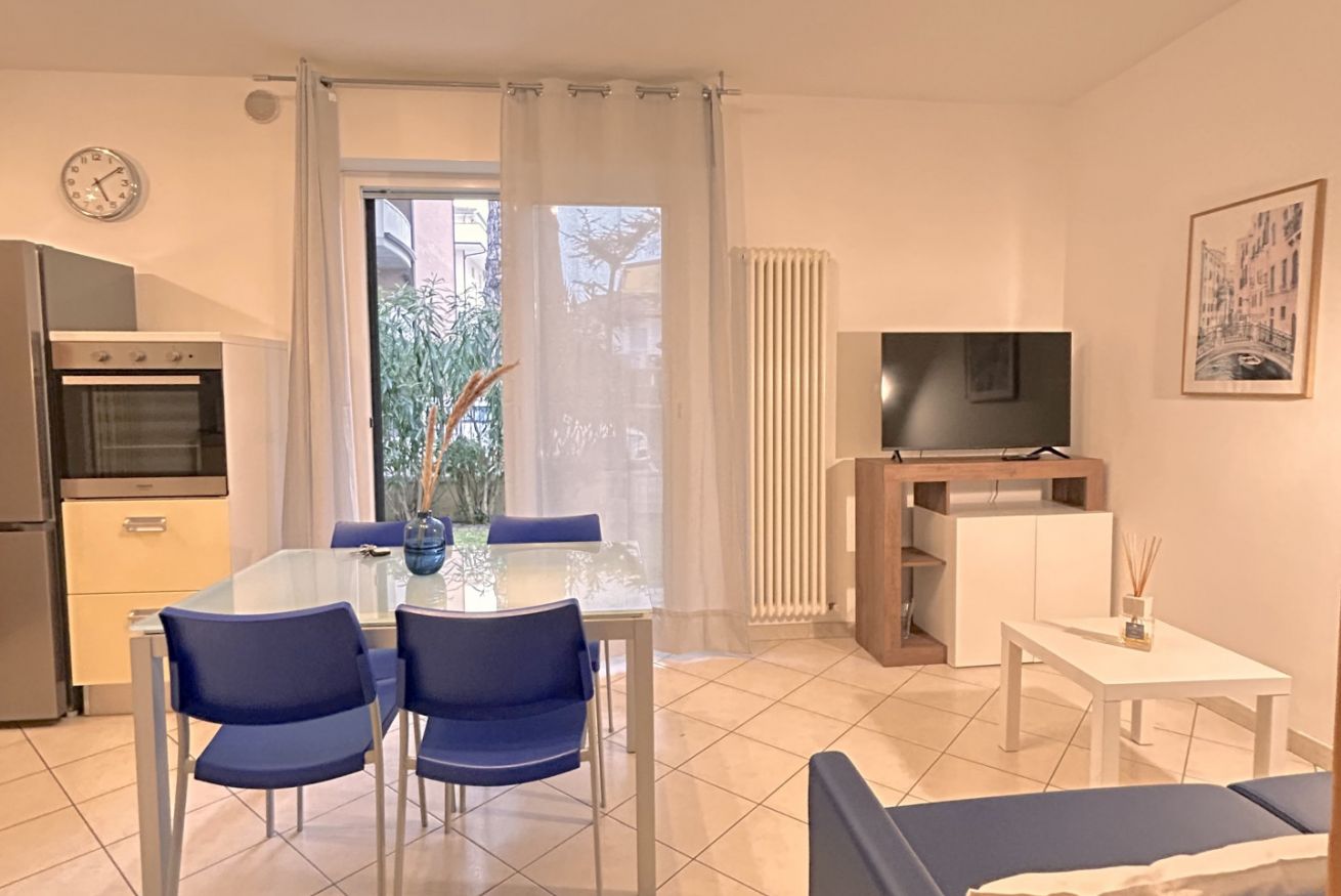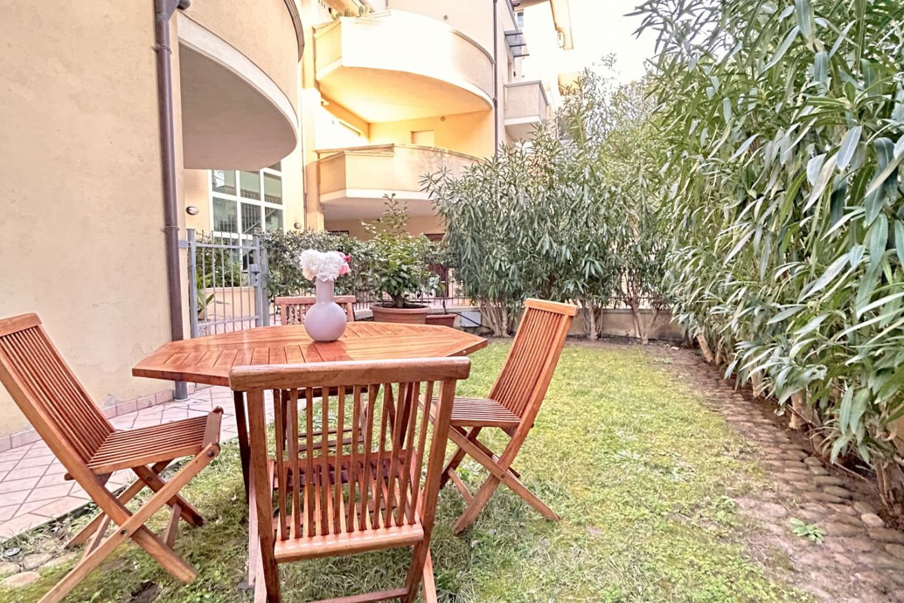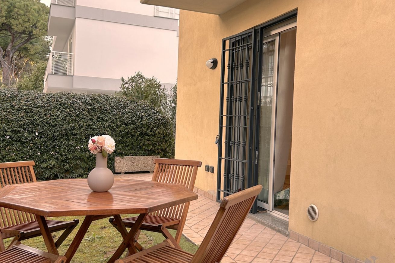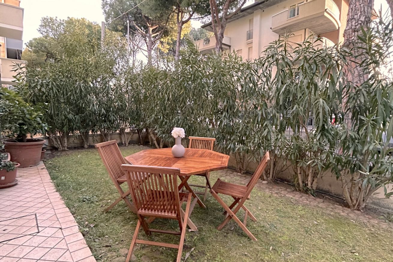 RICCIONE PAESE, ampio trilocale al piano terra con giardino e corte esterna privata e attrezzata per pranzi e cene all'aperto. Ingresso su soggiorno con angolo cottura dotato di lavastoviglie, proseguendo, tramite un corridoio troviamo un bagno finestrato dotato di box doccia e due camere matrimoniali.